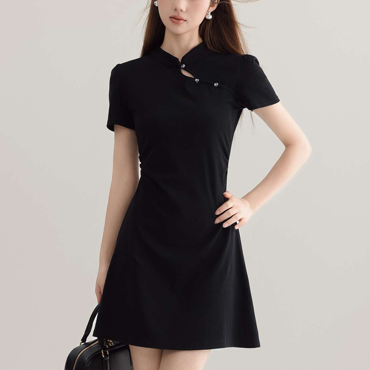 エレガントなチャイナカラーの黒ワンピースは、女性らしさを引き立てながらも知的な印象を与えるアイテムです。