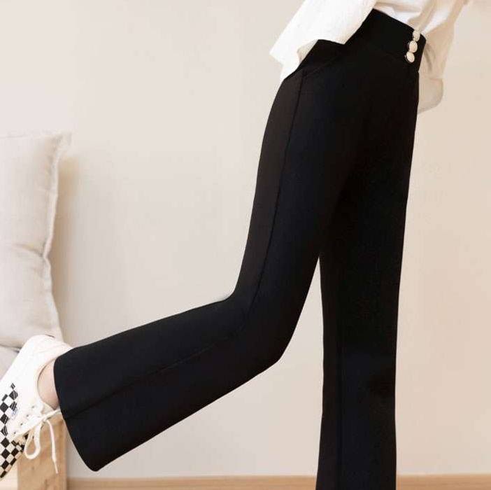 すっきりとしたフレアラインが美しいブラックパンツは、脚を長く細く見せてくれる優秀なアイテムです。