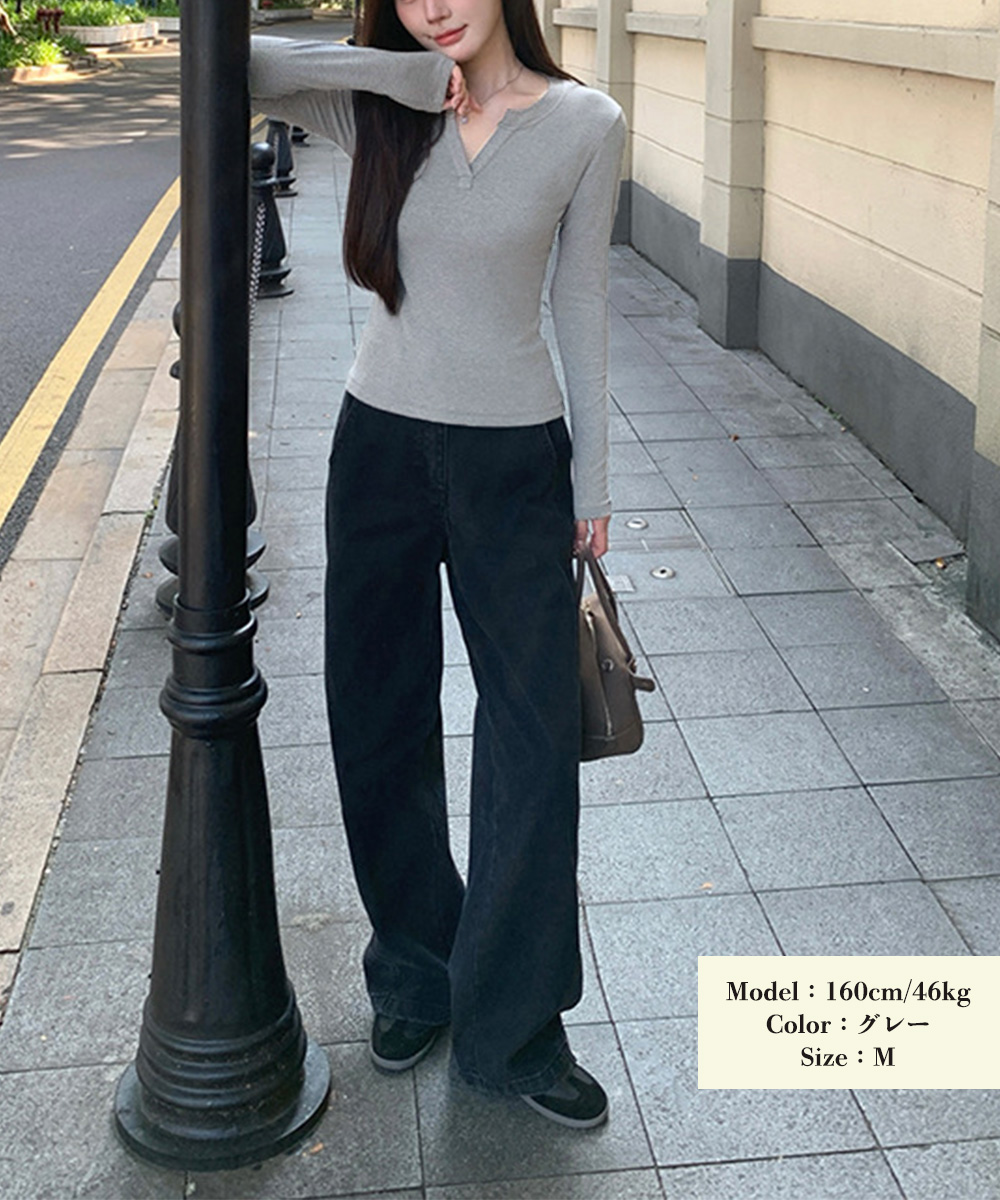 胸元のVカットがさりげないアクセントで大人っぽい雰囲気。