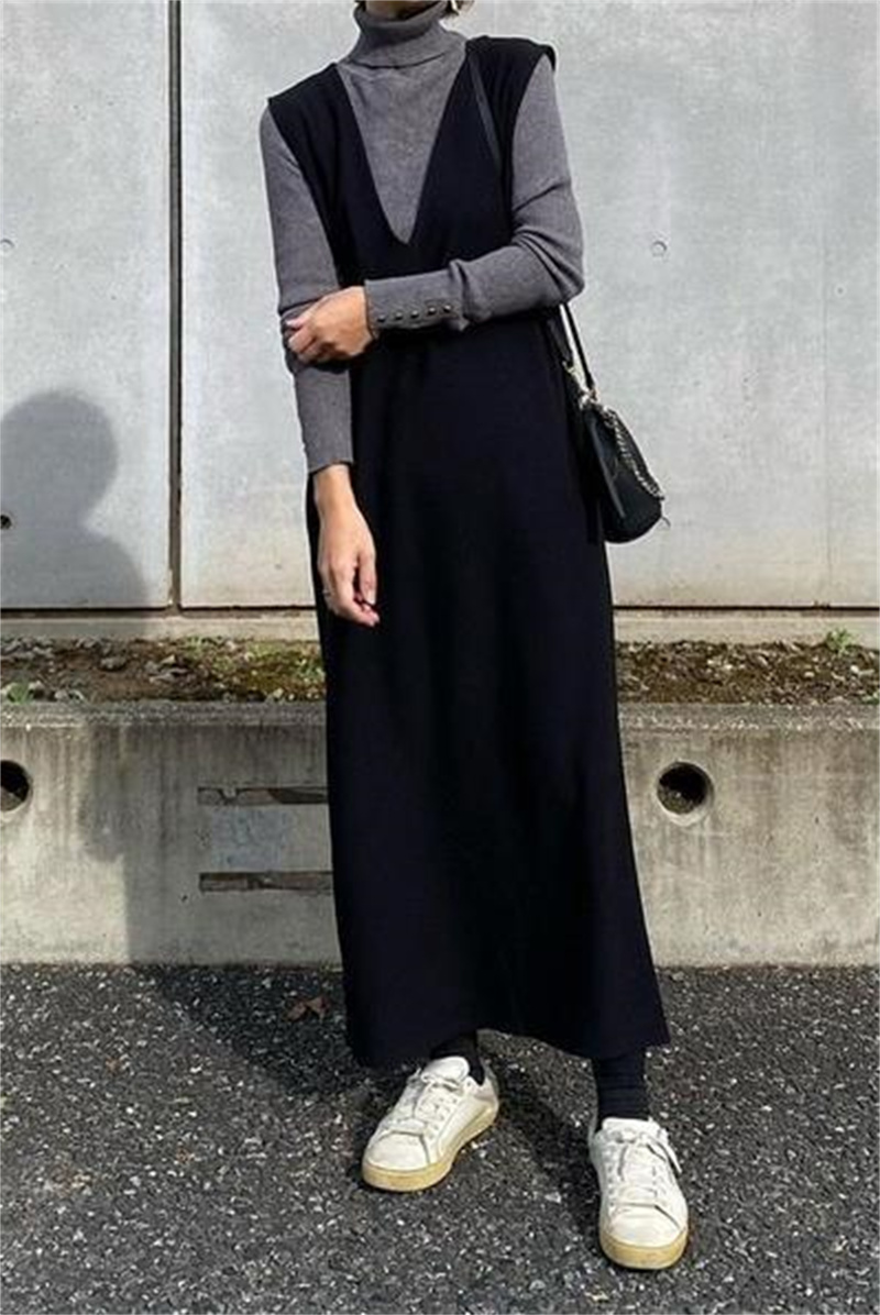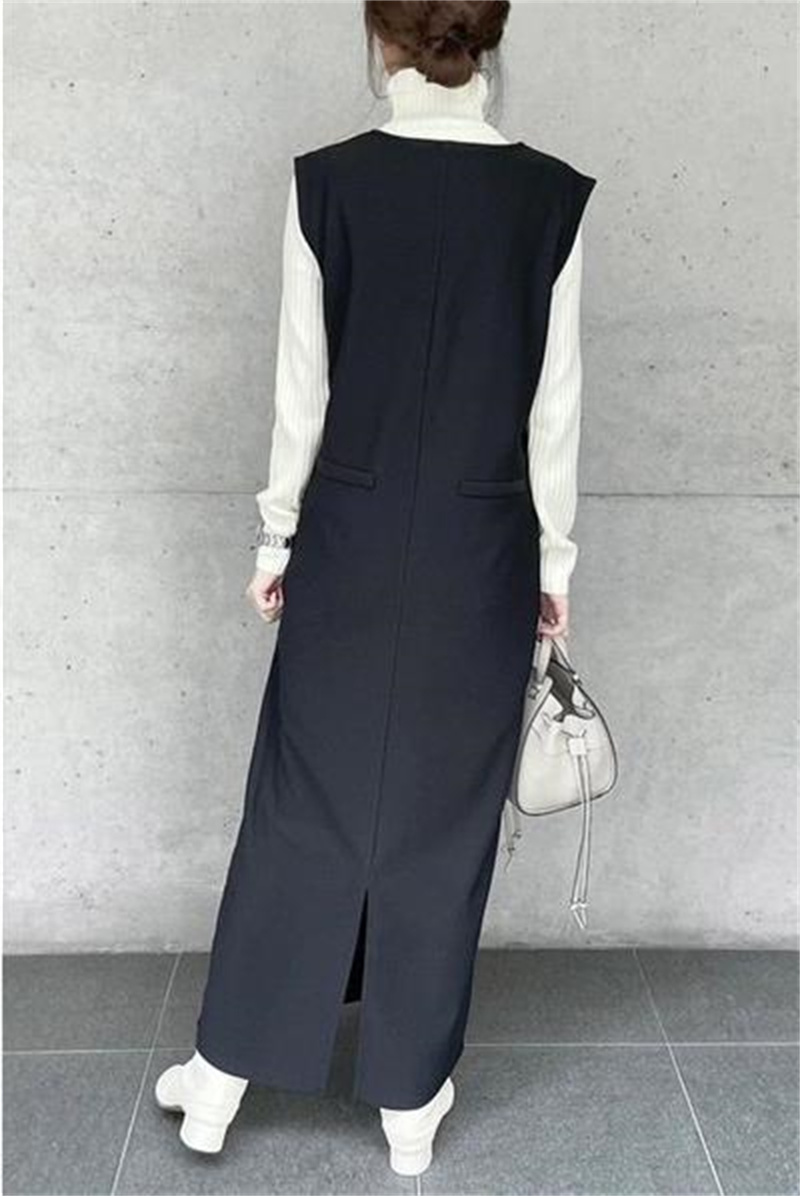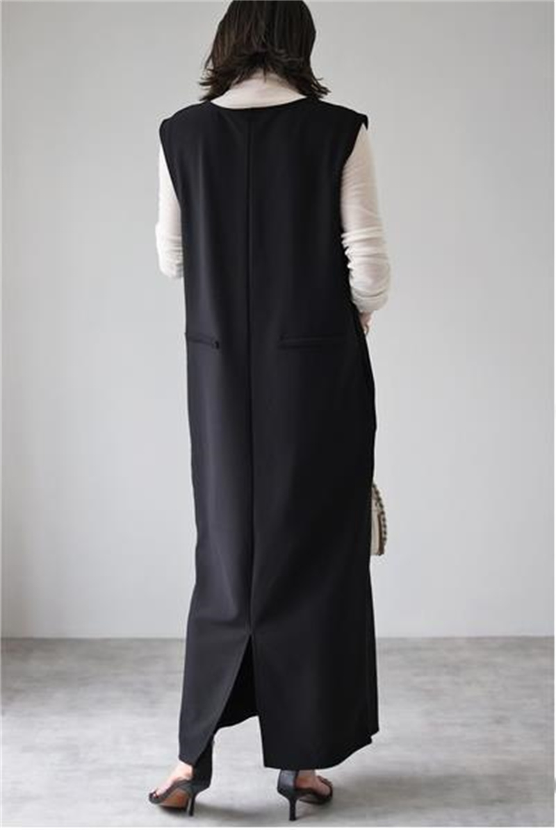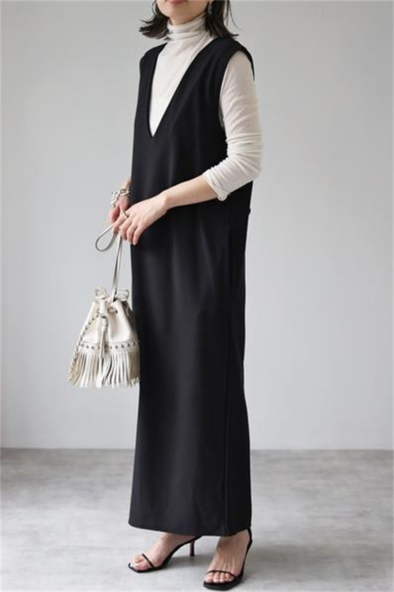 上品で大人可愛い黒のベストワンピースが入荷♪ 黒コーデの定番アイテムとして、普段使いから通勤まで幅広く活躍する一枚です。 深めのブイネックがエレガントな印象を演出し、マキシ丈で洗練されたスタイルを完成させます。