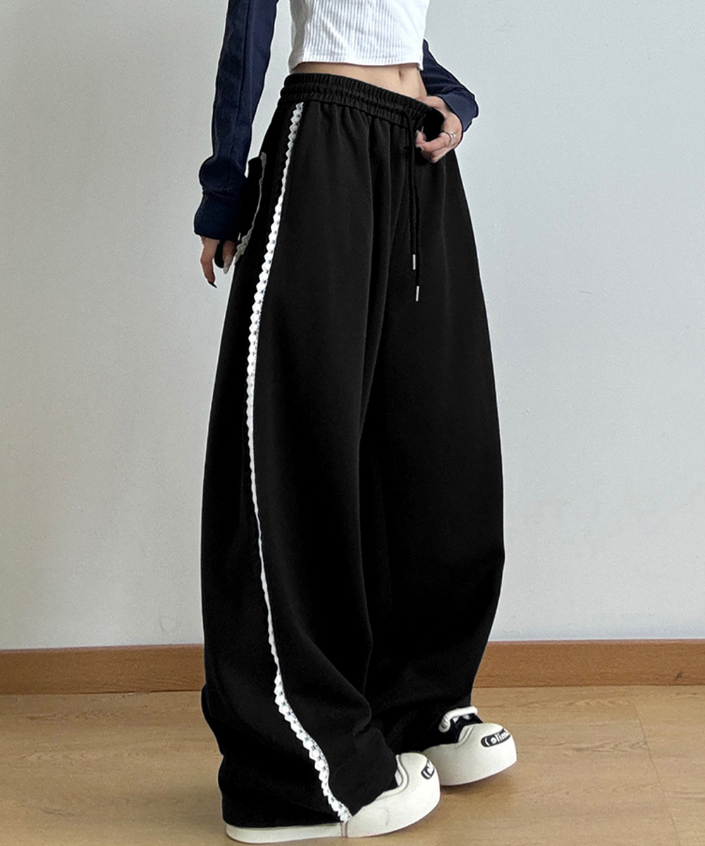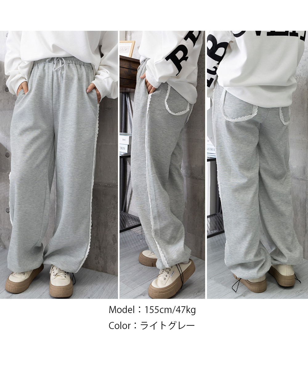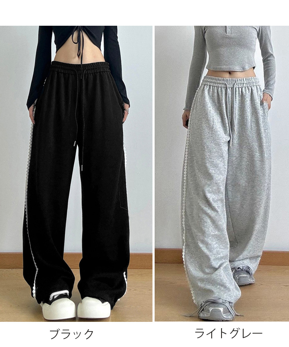 レディース ハイウエスト リラックスパンツ ウエストゴム ワイドパンツ ゆったり イージーパンツ 体型カバー ズボン秋冬 カジュアルパンツ黒 着やせロングパンツ ダンスボトムス脚長 カジュアルな中に、さりげない甘さを添えたスウェットパンツ。 サイドにあしらったホワイトレースが、スポーティーな印象にフェミニンなアクセントをプラス。 ウエストはゴムと紐の仕様で、リラックス感があり、ストレスフリーな着心地。 柔らかな肌触りのスウェット素材で、ロングシーズン着られるデイリー使いにぴったりの一枚。 素材:ポリエステル65%+綿35% カラー:ブラック/ライトグレー サイズ:ワンサイズ 着丈:約100cm 股下:約66cm ウエスト(ゴム仕様):約60-90cm ヒップ:約108cm もも周り:約62cm 裏地:なし 伸縮性:なし 透け感:なし