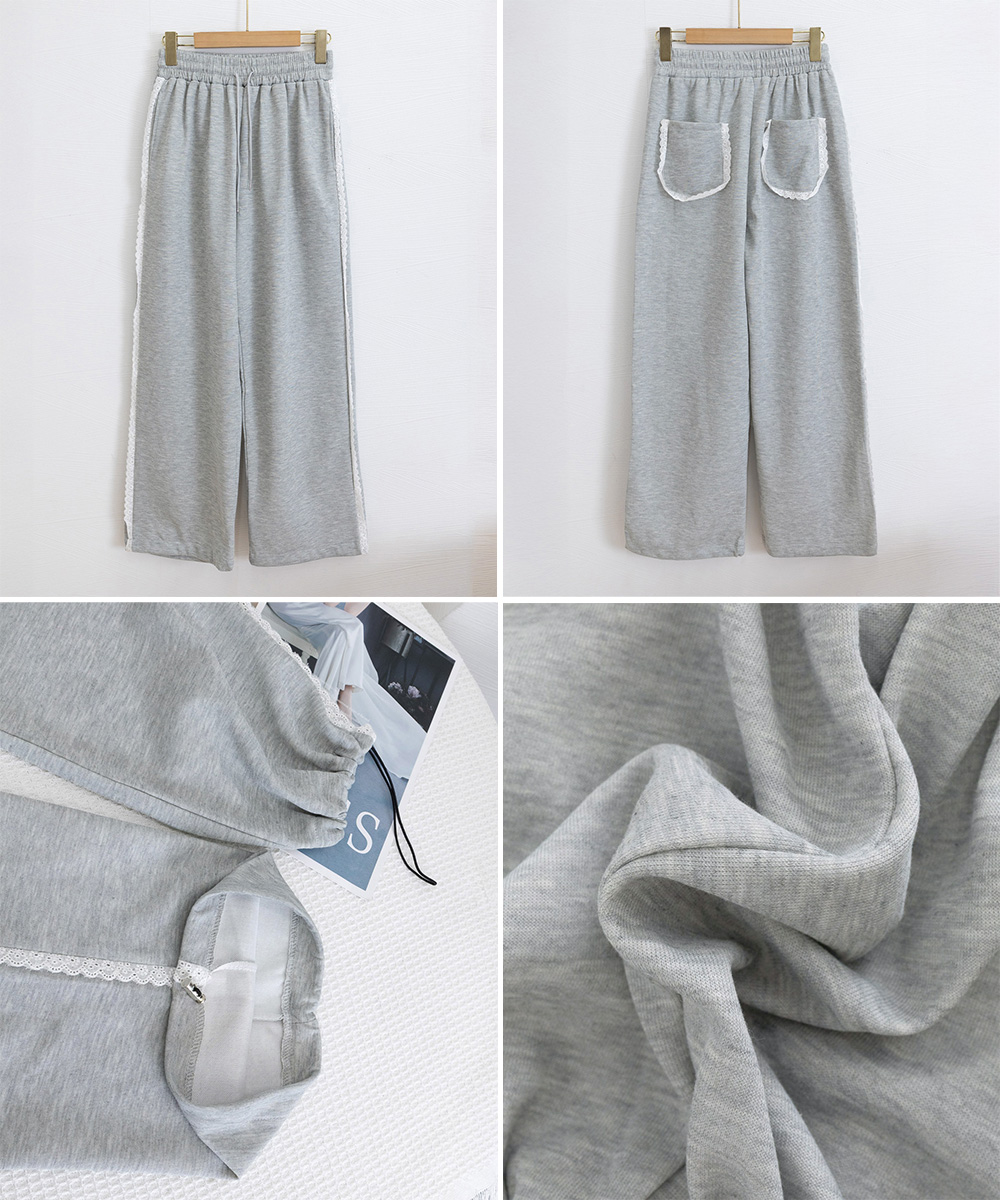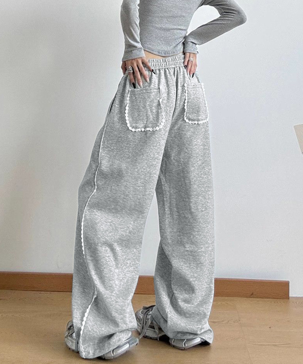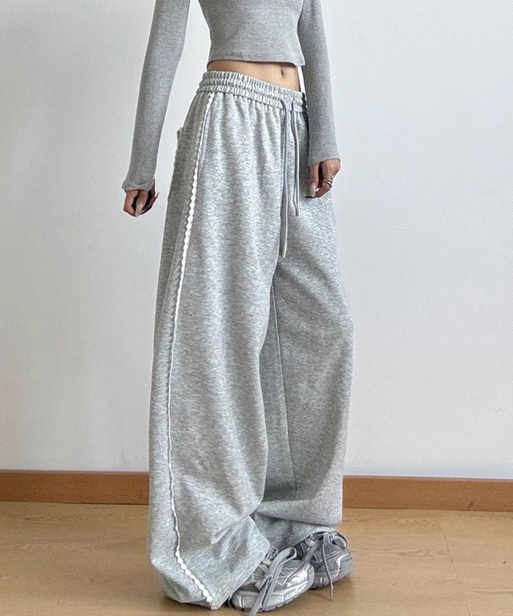 レディース ハイウエスト リラックスパンツ ウエストゴム ワイドパンツ ゆったり イージーパンツ 体型カバー ズボン秋冬 カジュアルパンツ黒 着やせロングパンツ ダンスボトムス脚長 カジュアルな中に、さりげない甘さを添えたスウェットパンツ。 サイドにあしらったホワイトレースが、スポーティーな印象にフェミニンなアクセントをプラス。 ウエストはゴムと紐の仕様で、リラックス感があり、ストレスフリーな着心地。 柔らかな肌触りのスウェット素材で、ロングシーズン着られるデイリー使いにぴったりの一枚。 素材:ポリエステル65%+綿35% カラー:ブラック/ライトグレー サイズ:ワンサイズ 着丈:約100cm 股下:約66cm ウエスト(ゴム仕様):約60-90cm ヒップ:約108cm もも周り:約62cm 裏地:なし 伸縮性:なし 透け感:なし