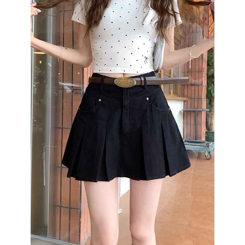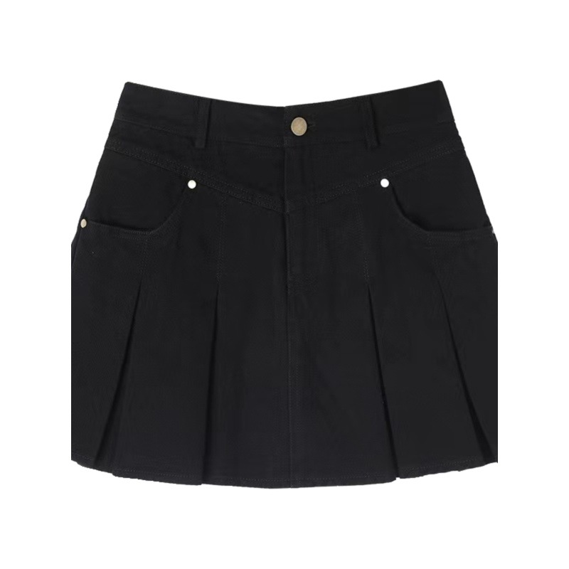 黒コーデに欠かせないデニム素材のプリーツスカートです。