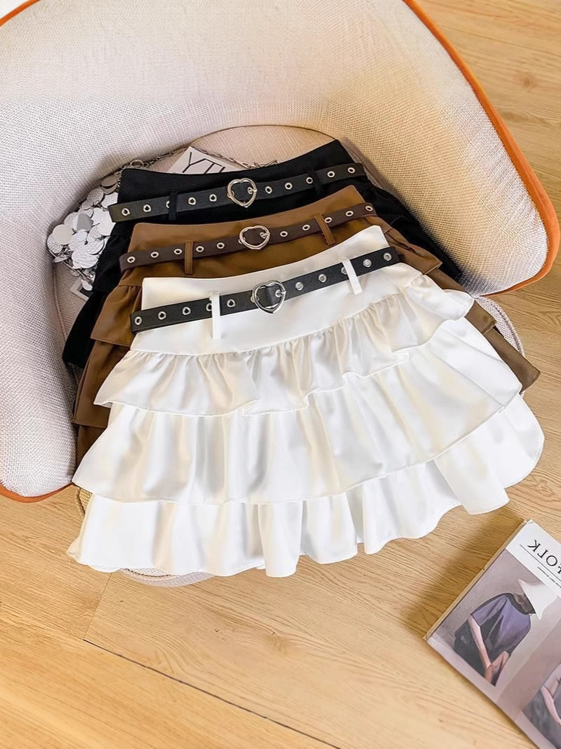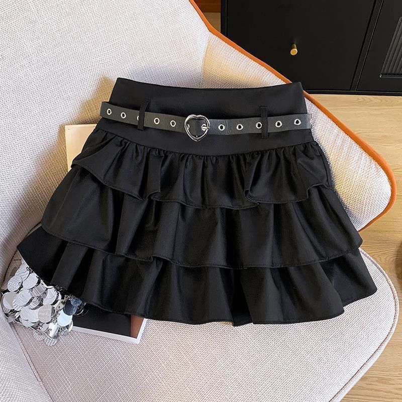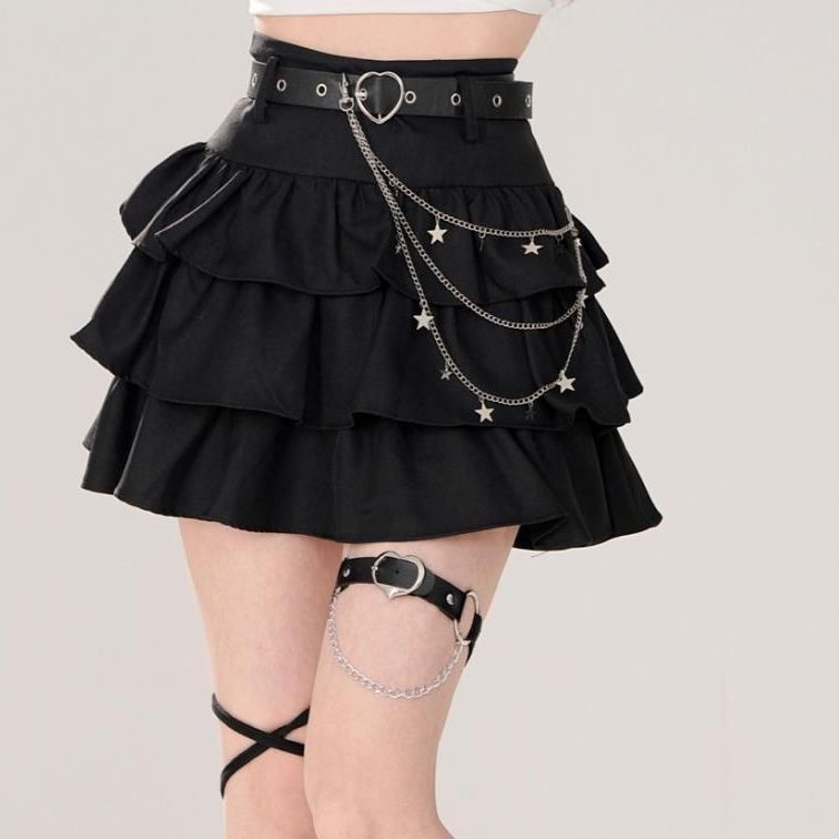 黒コーデに華やかさをプラスする三段のティアードフリルが魅力的なスカートです。 ウエスト部分にはハート型のバックルベルトとアイレットデザインが施され、星モチーフの揺れるチェーンが個性的なアクセントになっています。 ボリューム感のあるフリルが動くたびに揺れ、甘さと辛さを兼ね備えたスタイルを演出します。 黒コーデのスカートとして、個性的なファッションを楽しみたい方におすすめの一着です。