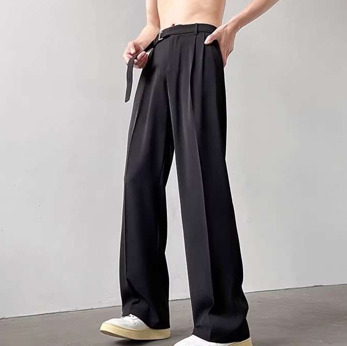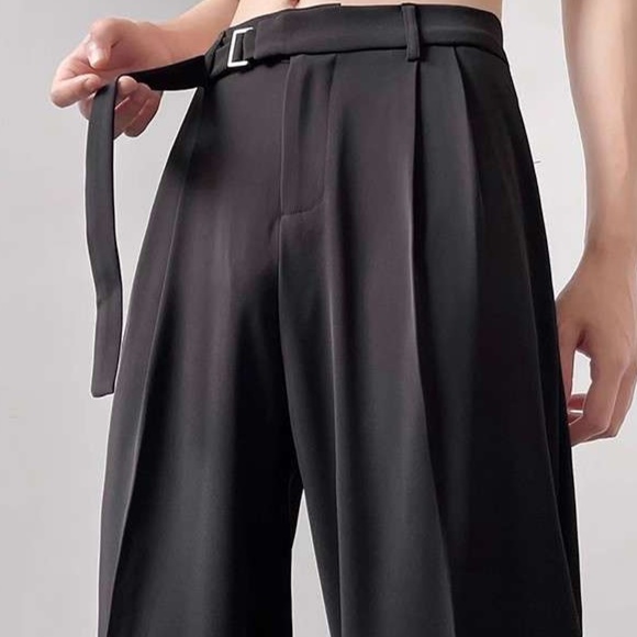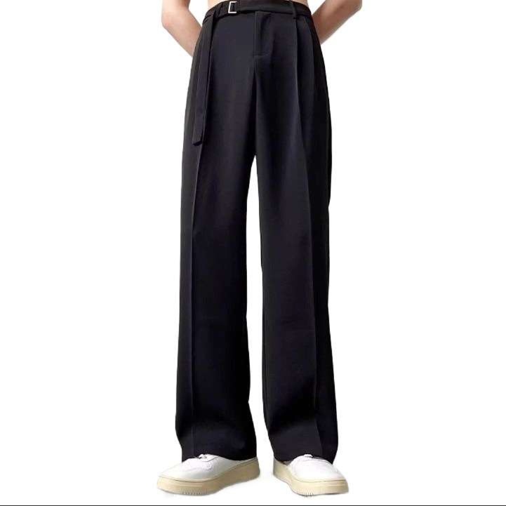 黒コーデにぴったりなエレガントなワイドレッグパンツ。高めのウエストと付属のベルトが魅力的なシルエットを作り出し、プリーツが施されているため、動きのあるドレープ感も楽しめる。カジュアルシーンからフォーマルな場面まで幅広く活躍し、白スニーカーとも絶妙なバランスが取れる一着。洗練されたスタイルを演出するアイテム。
